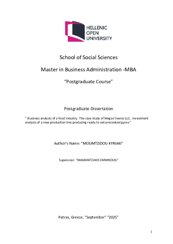 Ανάλυση επιχειρηματικότητας στον κλάδο των τροφίμων. Μελέτη της περίπτωσης Megas Yeeros LLC. Ανάλυση επένδυσης για νέα γραμμή παραγωγής έτοιμου προς κατανάλωση προψημένου γύρου. (Ελληνική)