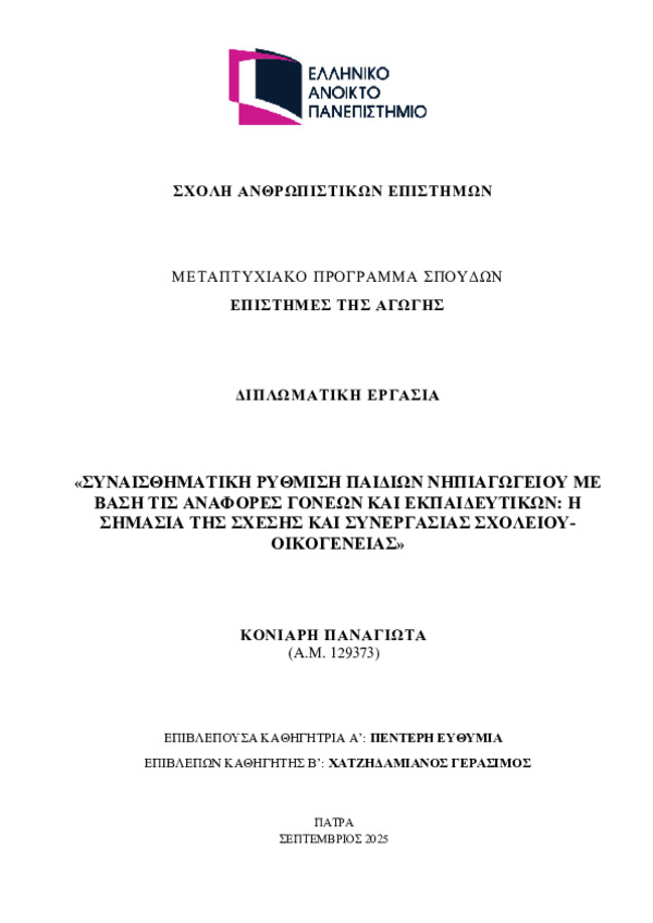 - συναισθηματική ρύθμιση, παιδιά προσχολικής ηλικίας, νηπιαγωγείο, γονείς, εκπαιδευτικοί, συνεργασία σχολείου-οικογένειας