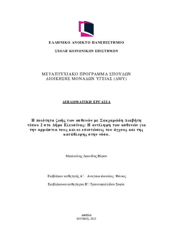 Η ποιότητα ζωής των ασθενών με Σακχαρώδη Διαβήτη τύπου 2 στο Δήμο Ελευσίνας: Η αντίληψη των ασθενών για την αρρώστια τους και οι επιπτώσεις του άγχους και της κατάθλιψης στην νόσο.