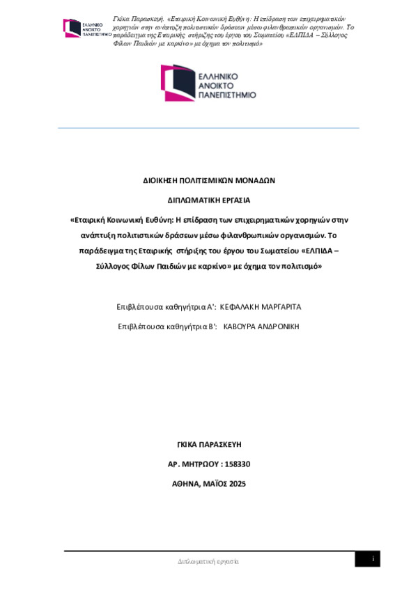 - Εταιρική Κοινωνική Ευθύνη, ενδιαφερόμενα μέρη, Διαμοιραζόμενη Αξία, Κοινωνική Ευθύνη Εκδηλώσεων, Φιλανθρωπικά σωματεία, Σωματείο «ΕΛΠΙΔΑ- Σύλλογος Φίλων Παιδιών με καρκίνο»