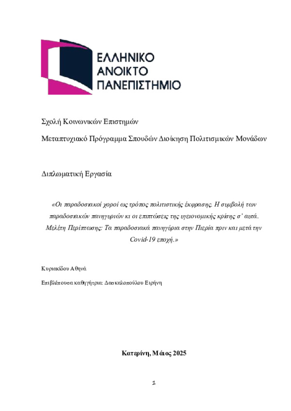 «Οι παραδοσιακοί χοροί ως τρόπος πολιτιστικής έκφρασης. H συμβολή των παραδοσιακών πανηγυριών κι οι επιπτώσεις της υγειονομικής κρίσης σ’ αυτά. Μελέτη Περίπτωσης: Τα παραδοσιακά πανηγύρια στην Πιερία πριν και μετά την Covid-19 εποχή.»