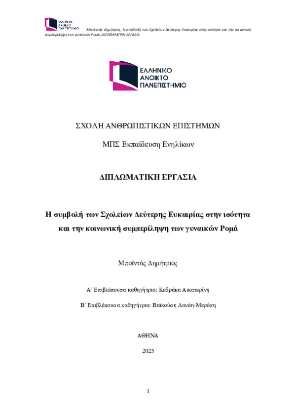 Στην παρούσα εργασία διερευνάται ο ρόλος των Σχολείων Δεύτερης Ευκαιρίας (ΣΔΕ) στην προώθηση της ισότητας και της κοινωνικής συμπερίληψης των γυναικών Ρομά, μιας ιδιαίτερα ευάλωτης και πολλαπλά αποκλεισμένης κοινωνικής ομάδας. Αντικείμενο της μελέτης αποτελεί η ανάλυση του πώς η συμμετοχή των γυναικών Ρομά στα ΣΔΕ επιδρά στις εκπαιδευτικές τους διαδρομές, στη συγκρότηση της ταυτότητάς τους και στη συνολικότερη κοινωνική τους ένταξη, λαμβάνοντας υπόψη τα πολλαπλά επίπεδα διακρίσεων που βιώνουν –έμφυλων, πολιτισμικών, ταξικών και θεσμικών.