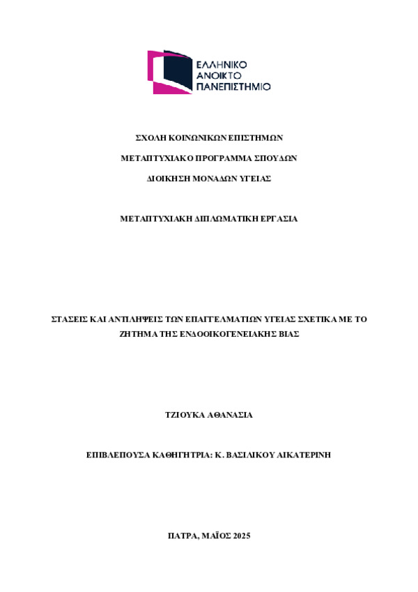 ΤΖΙΟΥΚΑ ΑΘΑΝΑΣΙΑ - ΣΤΑΣΕΙΣ ΚΑΙ ΑΝΤΙΛΗΨΕΙΣ ΤΩΝ ΕΠΑΓΓΕΜΛΑΤΙΩΝ ΥΓΕΙΑΣ ΣΧΕΤΙΚΑ ΜΕ ΤΟ ΖΗΤΗΜΑ ΤΗΣ ΕΝΔΟΟΙΚΟΓΕΝΕΙΑΚΗΣ ΒΙΑΣ - ΔΜΥ Περιγραφή: AthanasiaTziouka_DMY_DE.pdf (pdf)