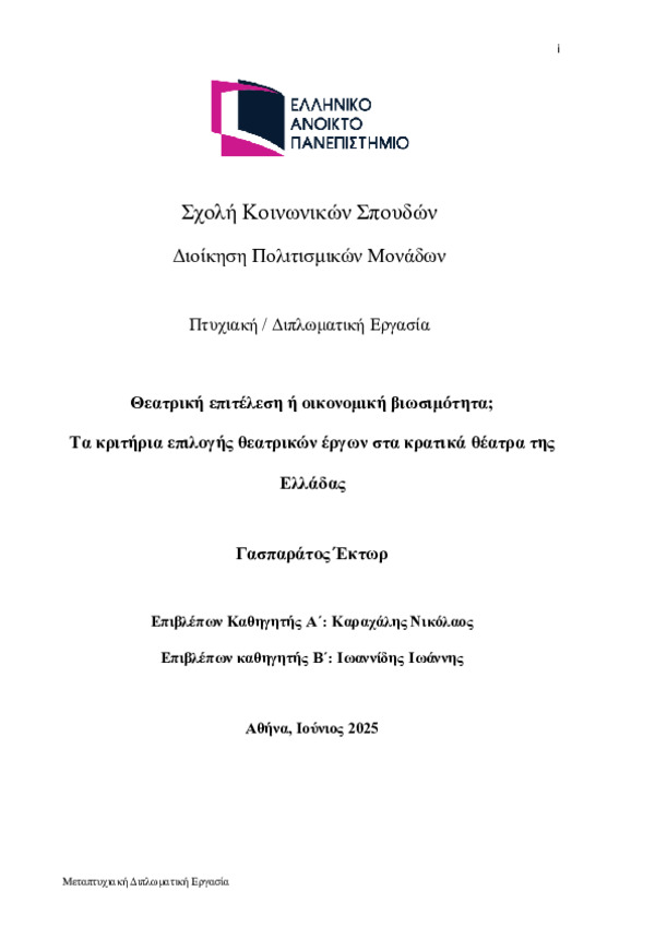 This paper aims to investigate the criteria used by the national theatres of Greece in selecting plays. Initially, we referred to the institution of theatre as part of the cultural industry. We then explored the theatre policy in Europe, culminating in a study of the artistic choices made by state theatres. As a method of gathering information regarding the repertoire choices of the country's state theatres, interviews were conducted with those responsible for the repertoire and -in their absence- with the artistic directors of the respective state theatres.
