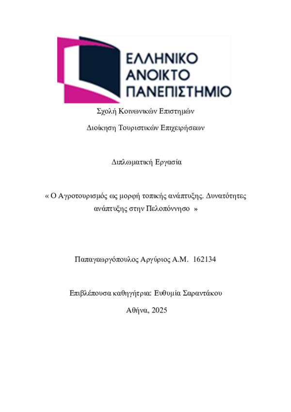 - Αγροτουρισμός , Εναλλακτικός τουρισμός, Βιώσιμη ανάπτυξη , Αγροτική οικονομία, Πελοπόννησος
