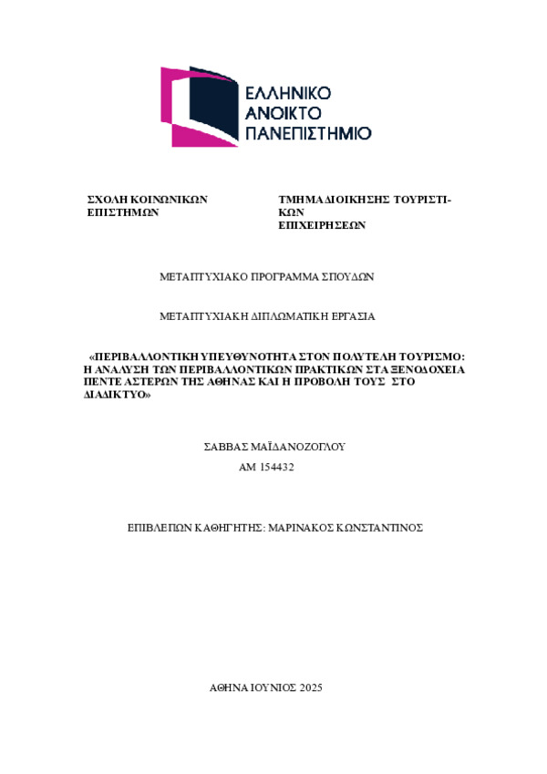Περιβαλλοντική υπευθυνότητα στον πολυτελή τουρισμό: Η ανάλυση των περιβαλλοντικών πρακτικών στα ξενοδοχεία πέντε αστέρων της Αθήνας και η προβολή τους στο διαδίκτυ