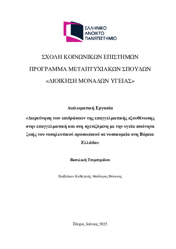 Διερεύνηση των επιδράσεων της επαγγελματικής εξουθένωσης στην ποιότητα επαγγελματικής ζωής και στη σχετιζόμενη με την υγεία ποιότητα ζωής του νοσηλευτικού προσωπικού σε νοσοκομεία της Βόρειας Ελλάδας