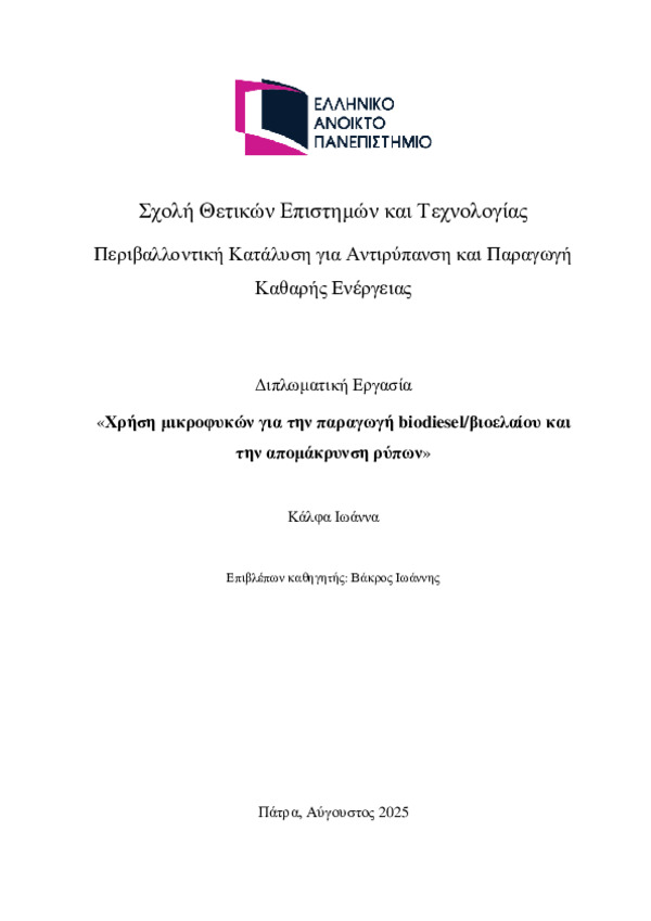 Χρήση μικροφυκών για την παραγωγή biodiesel/βιοελαίου και την απομάκρυνση ρύπων