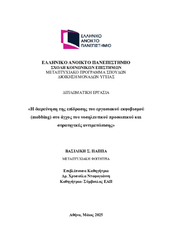 Εισαγωγή: Ο εργασιακός εκφοβισμός (mobbing) αποτελεί συστηματική, εχθρική και αντιδεοντολογική συμπεριφορά, με αρνητικές επιπτώσεις στην ευημερία των εργαζομένων. Οι συνέπειές του επηρεάζουν άμεσα τα θύματα, τα οποία συχνά εμφανίζουν σωματικά και ψυχολογικά προβλήματα και αυξημένες απουσίες. Στους υγειονομικούς χώρους το φαινόμενο συνδέεται με άγχος, χαμηλή επαγγελματική ικανοποίηση και πρόθεση αποχώρησης, γεγονός που υπονομεύει τόσο την αποδοτικότητα των μονάδων όσο και την ποιότητα της παρεχόμενης περίθαλψης.