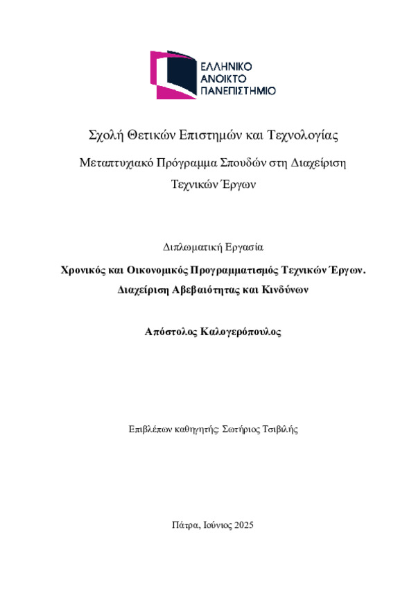 Χρονικός και Οικονομικός Προγραμματισμός Τεχνικών Έργων. Διαχείριση Αβεβαιότητας και Κινδύνων