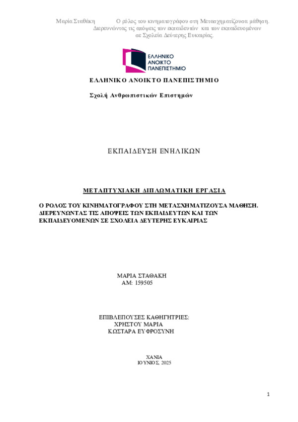 Αντικείμενο της παρούσας εργασίας είναι ο ρόλος του κινηματογράφου στη μετασχηματίζουσα μάθηση και στηρίζεται ερευνητικά στις απόψεις των εκπαιδευτών και των εκπαιδευομένων σε Σχολεία Δεύτερης Ευκαιρίας. Στο πεδίο της εκπαίδευσης ενηλίκων χρειάζεται περαιτέρω μελέτη για την εφαρμογή της κινηματογραφικής εκπαίδευσης ώστε να ενθαρρύνονται οι εκπαιδευτές και οι εκπαιδεύτριες να την ενσωματώνουν στη διδασκαλία τους. Οι ταινίες του κλασικού κινηματογράφου μπορούν να αποτελέσουν αφαλτήριο για αποπροσανατολιστικά διλήμματα τα οποία επιφέρουν μετασχηματισμό και ευνοούν τη μάθηση.