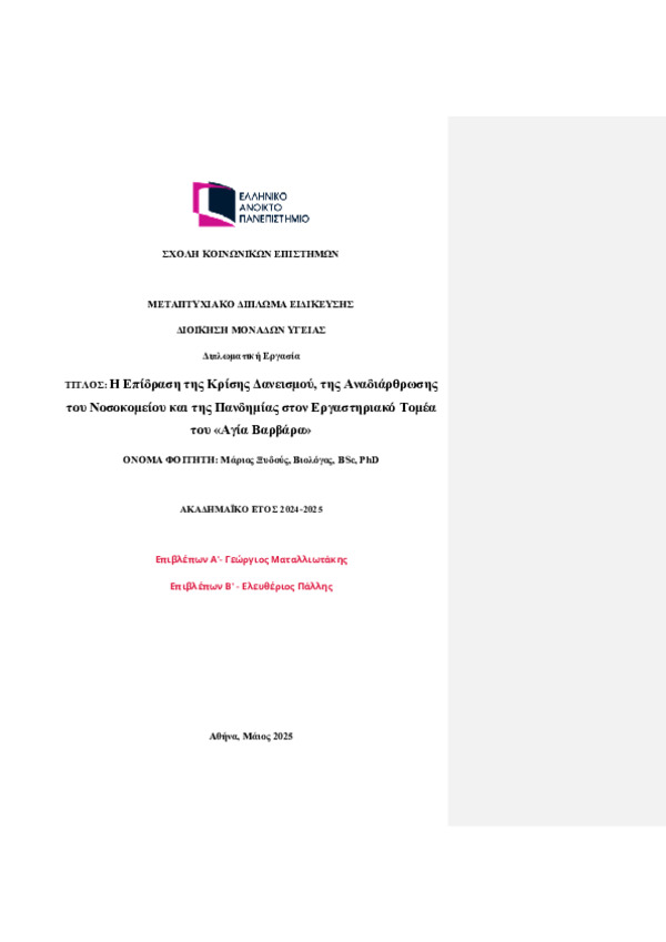 <p>The 15-year period from 2009 το 2024 was marked by the Greek debt crisis (2009‒2018) and the Covid-19 pandemic (2020‒2023), both of which necessitated the violent adaptation of the National Health System. This thesis studied the impact of the aforementioned events on the operation of the General Hospital of Western Attica (GHWA) “Aghia Varvara”, using as a measure the activity of the hospital’s laboratory sector. The data show that the GHWA was already in decline when, in 2013, it was decided to restructure it into a healthcare facility mainly providing primary care. Furthermore, although the GHWA has generally responded successfully to its new role, the current level of activity definitely falls short of its full potential. Finally, regarding Covid-19, although the GHWA functioned mainly as a support structure and treated patients only during the three waves of the pandemic, it spent over 10% of the total exam cost for 2020‒2021 on performing lab tests on these patients.</p>