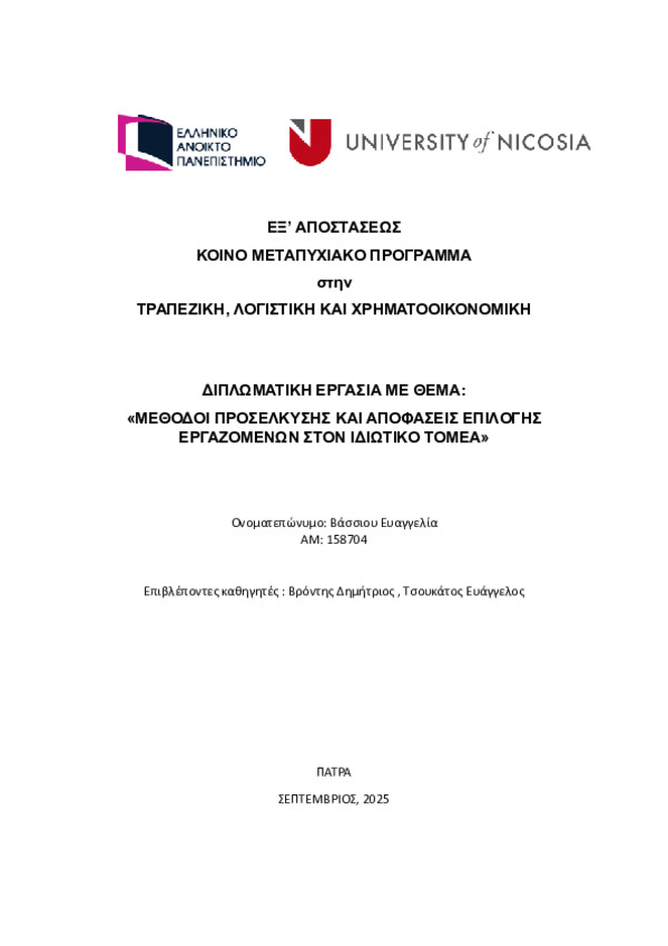 Η παρούσα έρευνα εξετάζει τις μεθόδους προσέλκυσης και τις αποφάσεις επιλογής εργαζομένων στον ιδιωτικό τομέα, με στόχο την κατανόηση των στρατηγικών που εφαρμόζουν οι επιχειρήσεις για την κάλυψη αναγκών σε ανθρώπινο δυναμικό. Η μεθοδολογία στηρίχθηκε σε ποσοτική έρευνα μέσω ερωτηματολογίου που διανεμήθηκε σε 53 εργαζομένους και στελέχη επιχειρήσεων διαφορετικών κλάδων και μεγεθών. Συλλέχθηκαν δεδομένα για τις χρησιμοποιούμενες μεθόδους προσέλκυσης, τα κριτήρια επιλογής, τις απαιτούμενες δεξιότητες και τις κύριες δυσκολίες που αντιμετωπίζουν οι εργοδότες. Η ανάλυση περιλάμβανε περιγραφικά στατιστικά, δείκτες αξιοπιστίας και μονοπαραγοντική ανάλυση διακύμανσης (ANOVA) για τη διερεύνηση διαφορών με βάση τα χαρακτηριστικά των επιχειρήσεων. Τα αποτελέσματα έδειξαν ότι οι προσωπικές συστάσεις και τα κοινωνικά δίκτυα αποτελούν τα πιο διαδεδομένα κανάλια προσέλκυσης, ενώ η προϋπηρεσία, οι δεξιότητες επικοινωνίας και η προσαρμοστικότητα αναδείχθηκαν ως οι σημαντικότεροι παράγοντες επιλογής. Επιπλέον, η έλλειψη κατάλληλων υποψηφίων και οι περιορισμένες οικονομικές απολαβές καταγράφηκαν ως οι κυριότερες προκλήσεις στη διαδικασία προσέλκυσης και επιλογής προσωπικού.