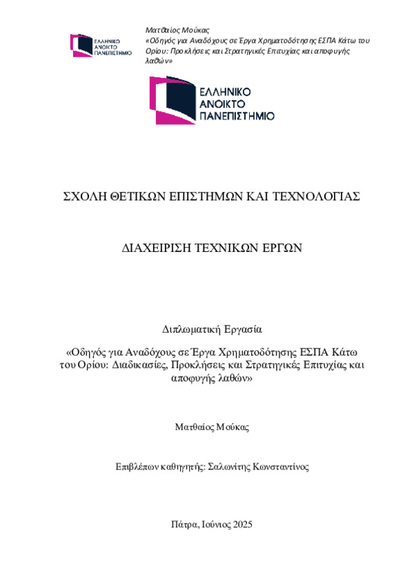Η παρούσα διπλωματική εργασία στοχεύει στην ανάπτυξη ενός πρακτικού οδηγού για εργολάβους που συμμετέχουν ή επιθυμούν να συμμετάσχουν σε έργα που χρηματοδοτούνται από την ΕΕ κάτω από το όριο. Η μελέτη αναλύει το νομικό και κανονιστικό πλαίσιο, με ιδιαίτερη έμφαση στον Ν. 4412/2016, και τις διαδικασίες ανάθεσης και διαχείρισης αυτών των έργων. Στόχος είναι η καταγραφή των προκλήσεων που αντιμετωπίζουν οι εργολάβοι στην πράξη και ο εντοπισμός επιτυχημένων στρατηγικών που θα βοηθήσουν στην αποφυγή λαθών και καθυστερήσεων.