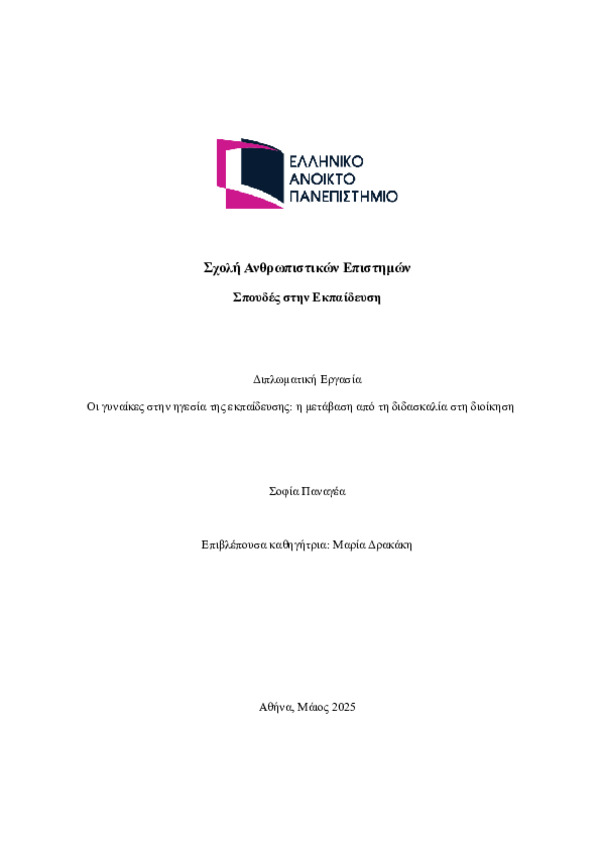 This Master’s Thesis explores the transition of female educators from teaching to school leadership, focusing on the personal and professional challenges they face, as well as the formation of their new professional identity. The study is based on a qualitative methodology, using interviews with eight female high school principals in the Attica region. The aim was to highlight their experiences regarding how they perceived the transition, the difficulties they encountered on both personal and professional levels, and the role of gender stereotypes in this process.