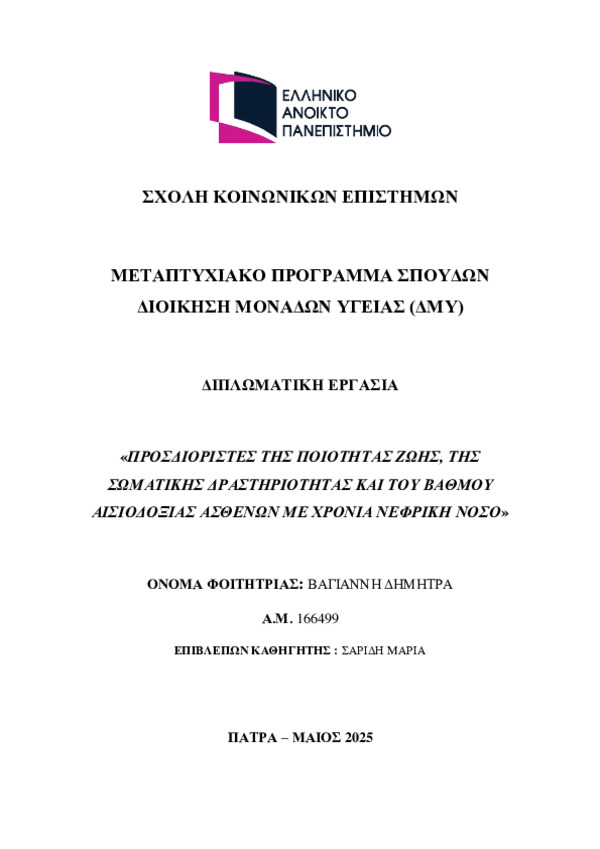 αιμοκάθαρση, αισιοδοξία, ποιότητα ζωής, σωματική δραστηριότητα, χρόνια νεφρική νόσος.