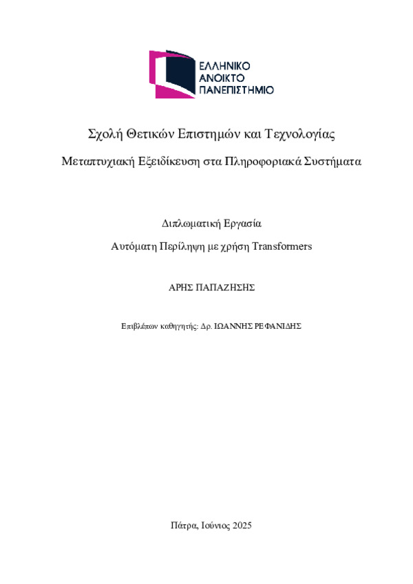• The subject of this thesis is the provision of a title from medical articles based on the abstracts of the articles. Title prediction was treated as a kind of automatic summary of the article summary. Therefore, the investigation was based on the problem of automatic summary and the modern techniques that follow the developments in the field of Machine Learning and Neural Networks, taking into account the limitations that continue to define this problem. For the purpose of the work, the titles and abstracts of a total of 10000 topic specific articles from the public medical library PubMed, published in the year 2024, were used. For the creation of the dataset, the summaries and titles of the articles were downloaded using the DEiXTo tool, while for the implementation of the experiment the pre-trained language model facebook/bart-large-cnn, suitable for the task of automatic summarization, was used. The selected model was trained on a total of 8000 pairs of article summaries and their titles and tested on 1000 article summaries. The ROUGE and BLEU metrics were used to evaluate the results, the former widespread in the evaluation of automatic summaries, and the latter in machine translation. The results measurements moved relatively close to the expected levels, demonstrating the specificity of the problem of automatic summarization. Indicative of this peculiarity are the results of the comparison made between the titles produced by the trained model and those predicted by the Gemini 2.0 language model. In particular, the predicted titles of the second model included titles very similar to those produced by the first model, as well as very different ones. The results of the thesis confirm the scope for further research and development in the field of automatic summarization, while at the same time the present paper demonstrates one of the many different implementations of the field.
