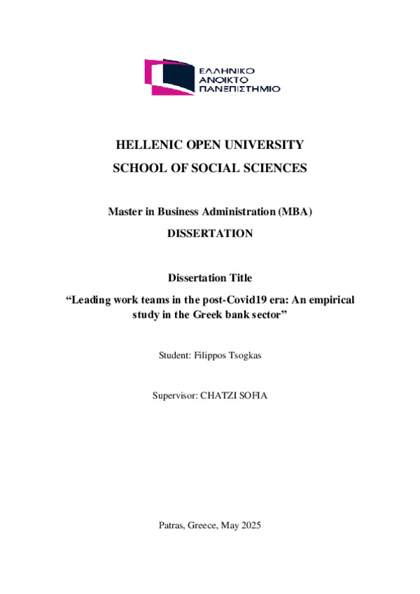 Η πανδημία COVID-19 είχε ως αποτέλεσμα να αλλάξει δραστικά τη δυναμική στον χώρο εργασίας, καθιστώντας απαραίτητη την υιοθέτηση προσαρμοστικών ηγετικών προσεγγίσεων για την αποτελεσματική διαχείριση υβριδικών και εικονικών ομάδων. Η παρούσα διατριβή διερευνά τις πρακτικές ηγεσίας στον ελληνικό τραπεζικό τομέα στο πλαίσιο της μετά την COVID-19 εποχής, με έμφαση στον τρόπο με τον οποίο οι ηγέτες αντιμετώπισαν τις προκλήσεις που συνδέονται με την εξ αποστάσεως συνεργασία, την ψηφιακή επικοινωνία και τη συνοχή της ομάδας. Συγκεκριμένα οι βασικές μεταβλητές που εξετάστηκαν περιλαμβάνουν την καθοδήγηση από τον ηγέτη της ομάδας, την ψυχολογική ασφάλεια, την απόδοση της ομάδας, την γνωστική και συναισθηματική εμπιστοσύνη στον προϊστάμενο, την αντίληψη για την αποτελεσματική χρήση των εργαλείων και τεχνικών επικοινωνίας από τον ηγέτη, την αμοιβαία εμπιστοσύνη, την κοινή γνώση και την τεχνολογία για τη διευκόλυνση της συνεργασίας της ομάδας