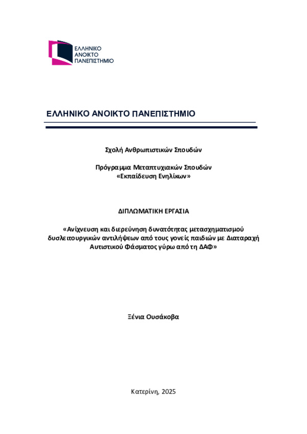 Detection and investigation of the possibility of transforming dysfunctional perceptions of parents of children with Autism Spectrum Disorder around ASD (Αγγλική)