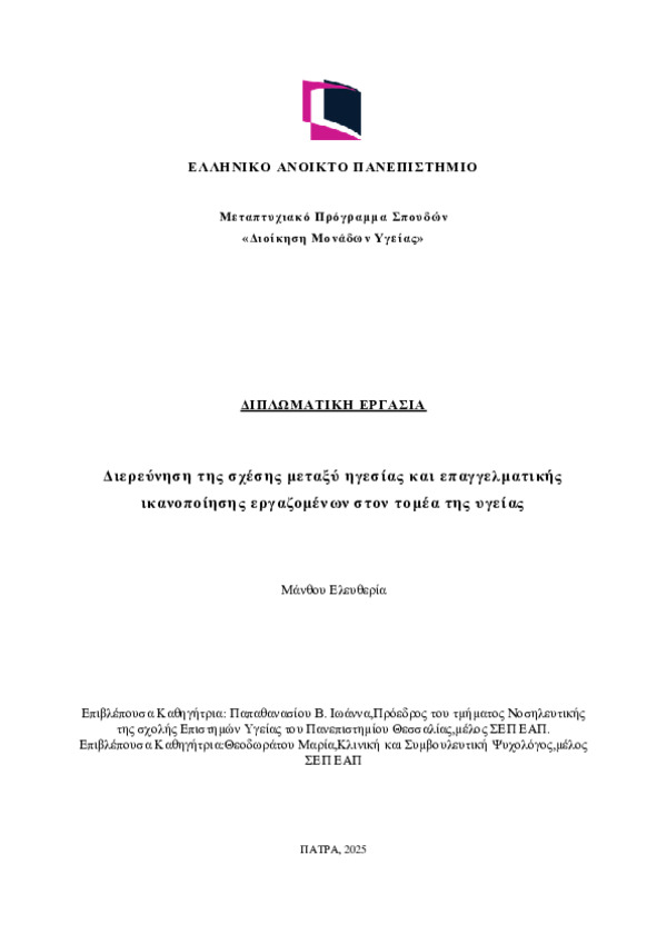 Περιγραφή: Διερεύνηση της σχέσης μεταξύ ηγεσίας και επαγγελματικής ικανοποίησης στον τομέα της υγείας-Μάνθου Ελευθερία - ΔΜΥ Διπλωματική Εργ.pdf (pdf) Book Reader