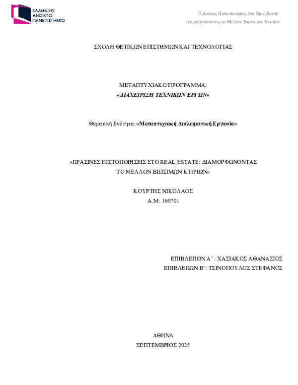 Η παρούσα Μεταπτυχιακή Διπλωματική Εργασία (ΜΔΕ), με τίτλο «Πράσινες Πιστοποιήσεις στο Real Estate: Διαμορφώνοντας το Μέλλον Βιώσιμων Κτιρίων», διερευνά τον ρόλο των διεθνών πιστοποιήσεων – κυρίως των LEED και BREEAM– στη διαμόρφωση της στρατηγικής και των επενδυτικών αποφάσεων στον τομέα του Real Estate. Η Αφετηρία της μελέτης είναι η ανάγκη μετάβασης σε βιώσιμα κτίρια που μειώνουν το περιβαλλοντικό αποτύπωμα και ενισχύουν την ενεργειακή αποδοτικότητα και την ελκυστικότητα των ακινήτων. Γίνεται παρουσίαση των συστημάτων «πράσινης» πιστοποίησης, ενώ ακόμα, αναλύεται η διαδικασία λήψης αυτής. Εξετάζεται η σημασία της βιωσιμότητας στον κατασκευαστικό κλάδο, η επίδραση στις επενδύσεις, καθώς και οι περιβαλλοντικές επιπτώσεις των πιστοποιημένων και μη πιστοποιημένων κτιρίων. Ακολουθεί αναλυτική παρουσίαση των επιμέρους μεθόδων μείωσης κόστους, όπως η προσέγγιση (Green) Value Engineering, πως λειτουργεί, τι αποτελέσματα έχει. Επιπλέον, εξετάζεται ο ρόλος των κριτηρίων ESG και του ευρωπαϊκού κανονιστικού πλαισίου, με ανάλυση της σημασία τους και της σύνδεσής τους με τον κλάδο του Real Estate.