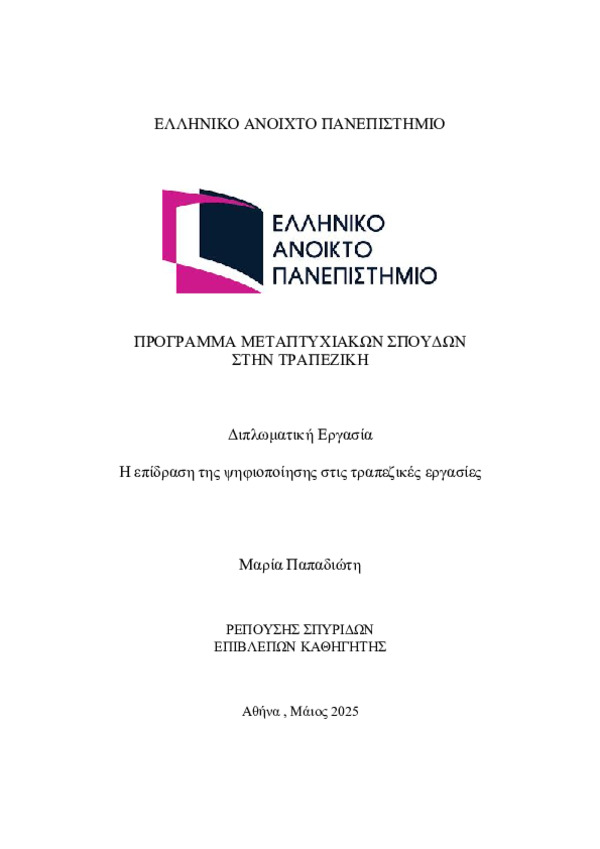 Η εργασία αυτή εξετάζει διεξοδικά τον ψηφιακό μετασχηματισμό στον τραπεζικό τομέα, έναν από τους πιο ραγδαία εξελισσόμενους κλάδους της οικονομίας. Ο σκοπός της είναι να αναδείξει τον τρόπο με τον οποίο η τεχνολογία έχει μεταμορφώσει τις τραπεζικές λειτουργίες, την εμπειρία των πελατών, αλλά και τις προκλήσεις που αναδύονται, με έμφαση στον ανθρώπινο παράγοντα.