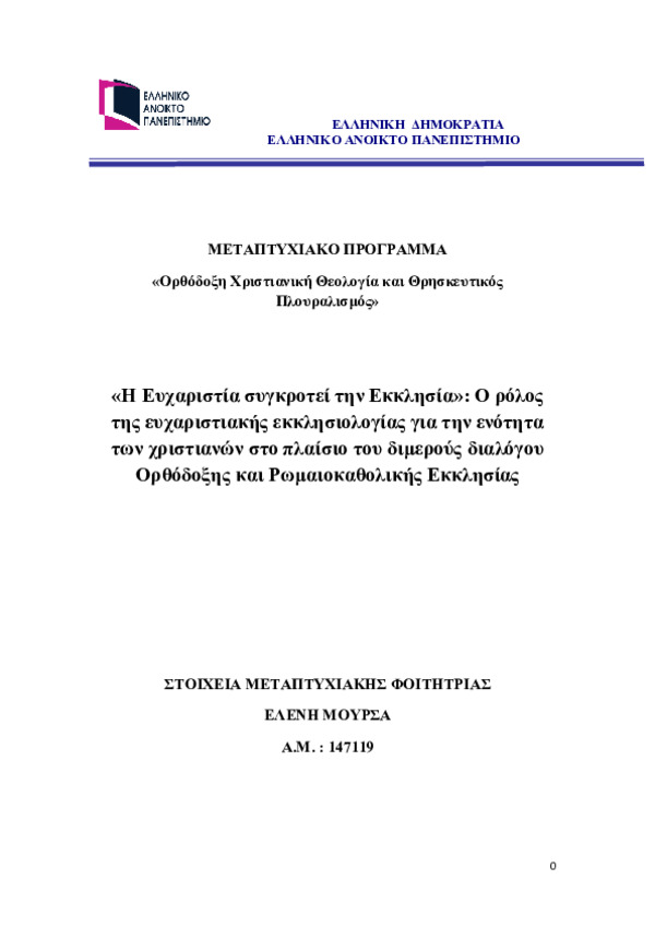 ΜΟΥΡΣΑ ΕΛΕΝΗ, «Η Ευχαριστία συγκροτεί την Εκκλησία»: Ο ρόλος της ευχαριστιακής εκκλησιολογίας για την ενότητα των χριστιανών στο πλαίσιο του διμερούς διαλόγου Ορθόδοξης και Ρωμαιοκαθολικής Εκκλησίας Περιγραφή: ΜΟΥΡΣΑ ΕΛΕΝΗ ΔΕ, Η Ευχαριστία συγκροτεί την Εκκλησία docx.pdf (pdf)