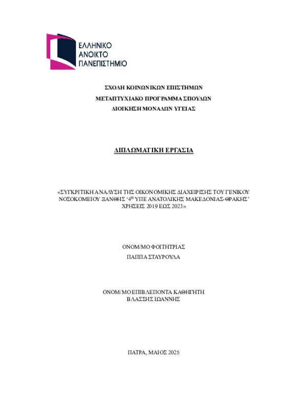 ΣΥΓΚΡΙΤΙΚΗ ΑΝΑΛΥΣΗ ΤΗΣ ΟΙΚΟΝΟΜΙΚΗΣ ΔΙΑΧΕΙΡΙΣΗΣ ΤΟΥ ΓΕΝΙΚΟΥ ΝΟΣΟΚΟΜΕΙΟΥ ΞΑΝΘΗΣ ‘4Η ΥΠΕ ΑΝΑΤΟΛΙΚΗΣ ΜΑΚΕΔΟΝΙΑΣ-ΘΡΑΚΗΣ’ ΧΡΗΣΕΙΣ 2019 ΕΩΣ 2023