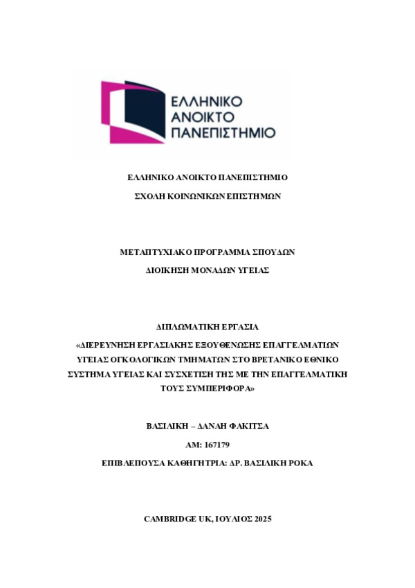 Διερεύνηση Εργασιακής Εξουθένωσης Επαγγελματιών Υγείας Ογκολογικών Τμημάτων στο Βρετανικό Εθνικό Σύστημα Υγείας και Συσχέτισή της με την Επαγγελματική τους Συμπεριφορά