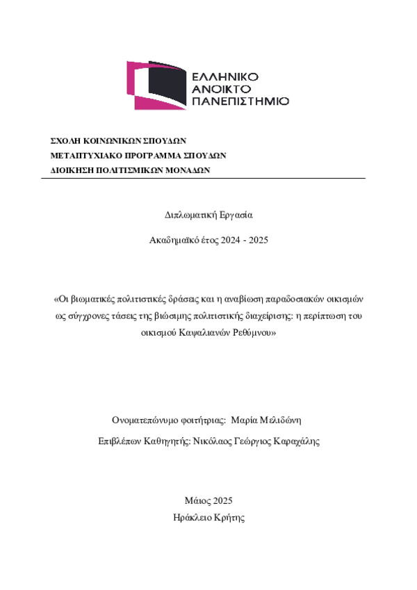 This dissertation explores the contemporary expressions of sustainable culture and its progressive transition from a traditional, passive form of tourist consumption toward an experiential, participatory approach, with a particular emphasis on traditional settlements. In the first part, through a literature review, the multifaceted concept of sustainable culture is analyzed, along with the factors that contributed to its development, as well as the new forms it has taken in the era of globalization and the experience economy. The notion of experiential activities is also examined, with an emphasis on the importance of authenticity, participation, and the sensory engagement of the traveler, as well as the challenges arising from the commodification of cultural experience. At the core of the discussion lies the potential of traditional settlements as carriers of cultural memory and authentic identity, which can serve as ideal destinations for the experience of cultural activities. Finally, the strategy of the Region of Crete to strengthen contemporary cultural tourism is briefly presented, aiming to tap into the island’s vast, underutilized potential — a place that exemplifies a saturated tourism image due to its coastal tourism development. At the end of the first part, three examples of village revival and cultural, experiential activities in Crete are presented.