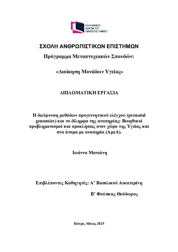 Η διεύρυνση μεθόδων προγεννητικού ελέγχου (prenatal genomics) και το δίλημμα της αναπηρίας: Βιοηθικοί προβληματισμοί και προκλήσεις στον χώρο της Υγείας και στα άτομα με αναπηρία (ΑμεΑ). - Identifier: 233921