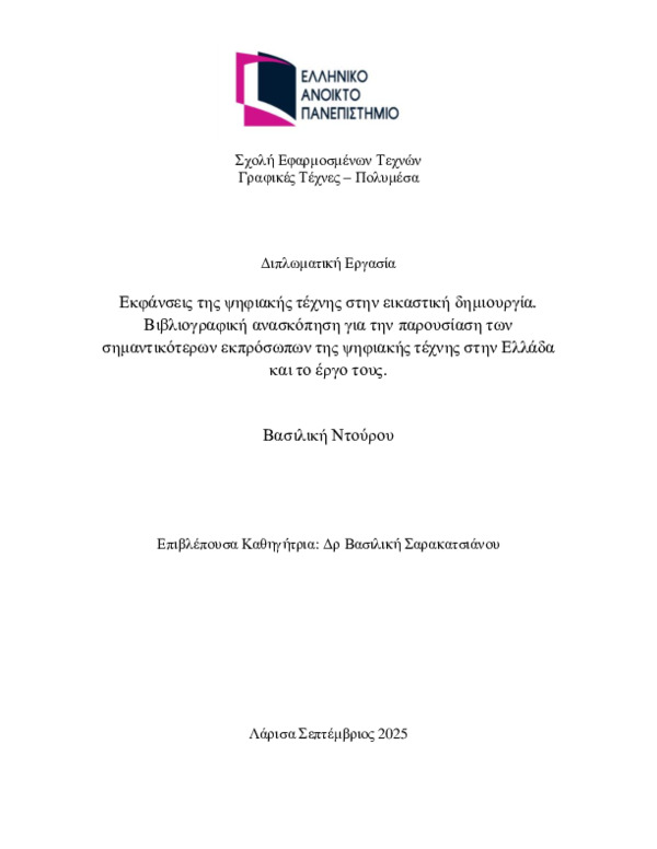 Η ψηφιακή τέχνη αποτελεί μια ραγδαία αναπτυσσόμενη μορφή καλλιτεχνικής έκφρασης, η οποία συνδυάζει την τεχνολογία με τη δημιουργικότητα, αναδιαμορφώνοντας τους τρόπους παραγωγής, διάδοσης και πρόσληψης της εικαστικής δημιουργίας. Η εργασία διερευνά τις εκφάνσεις της ψηφιακής τέχνης στο σύγχρονο πολιτιστικό τοπίο, με έμφαση σε ζητήματα που αφορούν την αυθεντικότητα, την πνευματική ιδιοκτησία, τη σχέση τέχνης και τεχνολογίας, καθώς και τη δυναμική των NFTs ως νέα μορφή κατοχύρωσης και εμπορικής αξιοποίησης των έργων τέχνης. Παρουσιάζονται χαρακτηριστικά παραδείγματα έργων και καλλιτεχνικών πρωτοβουλιών, τόσο σε διεθνές όσο και σε ελληνικό επίπεδο, αναδεικνύοντας τη συνύπαρξη δημιουργικών, τεχνικών και κοινωνικών παραμέτρων. Παράλληλα, αναλύονται οι απαιτήσεις σχεδιασμού, ανάπτυξης και αξιολόγησης ενός ψηφιακού έργου, ενσωματώνοντας σύγχρονες προσεγγίσεις, όπως η ευχρηστία, η προσβασιμότητα και η λειτουργικότητα. Από τη μελέτη προκύπτει ότι η ψηφιακή τέχνη δεν αποτελεί απλώς τεχνική καινοτομία, αλλά μια πολιτισμική στροφή που επαναπροσδιορίζει τη σχέση δημιουργού, έργου και κοινού, φέρνοντας στο προσκήνιο νέους τρόπους έκφρασης, διακίνησης και αντίληψης του εικαστικού αντικειμένου.
