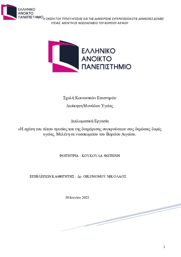 Η ΣΧΕΣΗ ΤΟΥ ΤΥΠΟΥ ΗΓΕΣΙΑΣ ΚΑΙ ΤΗΣ ΔΙΑΧΕΙΡΙΣΗΣ ΣΥΓΚΡΟΥΣΕΩΝ ΣΤΙΣ ΔΗΜΟΣΙΕΣ ΔΟΜΕΣ ΥΓΕΙΑΣ. ΜΕΛΕΤΗ ΣΕ ΝΟΣΟΚΟΜΕΙΟ ΤΟΥ ΒΟΡΕΙΟΥ ΑΙΓΑΙΟΥ