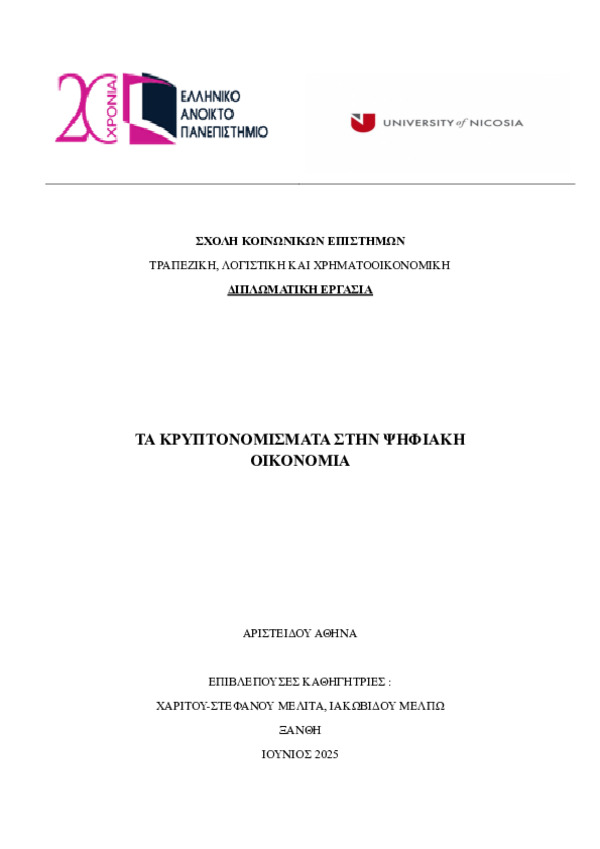 • Τα κρυπτονομίσματα αποτελούν πλέον ένα ευρέως γνωστό, ελκυστικό και πολυσυζητημένο θέμα τόσο για τους ειδικούς της οικονομίας αλλά και τον απλό λαό. Δεν αποτελούν απλώς «διαδικτυακά» χρήματα. Είναι μέρος μιας ευρύτερης τεχνολογικής και οικονομικής επανάστασης. Η συγκεκριμένη εργασία έχει στόχο, αρχικά, να εξηγήσει με τον απλούστερο δυνατό τρόπο τον όρο κρυπτονομίσματα. Τι είναι εν τέλει τα κρυπτονομίσματα, πώς λειτουργούν, που τα βρίσκουμε, πότε και πώς δημιουργήθηκαν, αποτελούν αναμφίβολα ερωτήματα τα οποία απασχολούν όλο και περισσότερους δυνητικούς αγοραστές/χρήστες κτυπτονομισμάτων. Στη συνέχεια, γίνεται αναφορά στην ιστορική πορεία των κρυπτονομισμάτων, όπου απαντώνται ερωτήματα όπως πού πρωτοεμφανίστηκαν, ποιοί είναι οι δημιουργοί τους, πώς εξελίχθηκαν. Βέβαια, δεν είναι όλα τα κρυπτονομίσματα το ίδιο διαδεδομένα και ισχυρά. Ακολουθεί ανάλυση σημαντικών πτυχών των κρυπτονομισμάτων, όπως η τεχνολογία blockchain και η κρυπτολογία. Στην συνέχεια, η συγκεκριμένη εργασία, προσπαθεί να εντοπίσει σημαντικά κριτήρια για την εκτίμηση και αξιολόγηση της θέσης των κρυπτονομισμάτων αλλά και να ερευνήσει κατά πόσο μια επένδυση σε αυτού του είδους τα περιουσιακά στοιχεία αποτελεί καλή επιλογή για υπάρχοντες ή δυνητικούς επενδυτές. Τα συμπεράσματα της έρευνας τεκμηριώνονται από μια ποσοτική ανάλυση που ακολουθεί. Τέλος, γίνονται προβλέψεις σχετικά με το μέλλον και την πορεία των κρυπτονομισμάτων.