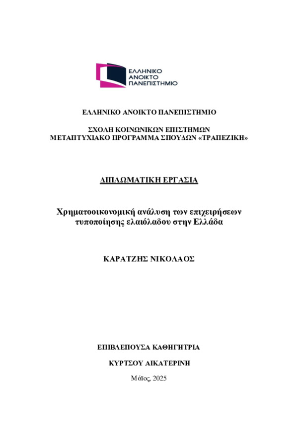 Η παρούσα διπλωματική εργασία πραγματεύεται την χρηματοοικονομική ανάλυση του κλάδου τυποποίησης ελαιόλαδου με ιδιαίτερη έμφαση στις επιχειρήσεις που δραστηριοποιούνται στην τυποποίηση ελαιόλαδου στην Ελλάδα.