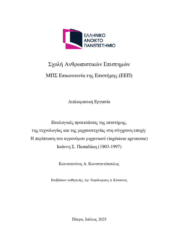 This Master’s dissertation explores the influences and implications of science, technology, and engineering in the modern era, through an analysis of the career and work of agronomist engineer Ioannis S. Papadakis (1903–1997). By focusing on Papadakis as a case study, the research aims to assess his scientific contributions in relation to the political and social contexts of the countries in which he was active. The biographical approach highlights Papadakis as a forerunner of the techno-scientist, at a time when such a role had not yet been widely established or recognized. Of particular interest is the fact that Papadakis’s multifaceted activity was expressed through his identity as an engineer -specifically, as an agronomist engineer- within the framework of agronomic science. He engaged with all subfields of his discipline and is internationally regarded as a founding figure of Ecological Agriculture (Écologie Agricole). His extensive body of work can be categorized into three distinct phases: (a) experimental, primarily during his early years; (b) research-oriented, during the mature period of his life; and (c) philosophical, in his later years. These characteristics, especially after 1960, are associated with the emergence of a new type of intellectual one who cannot be classified solely as a scientist, engineer, or technologist, but rather embodies a hybrid form of knowledge and praxis.