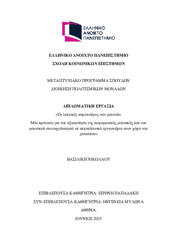 «Οι λεκτικές παρτιτούρες στο μουσείο: Μία πρόταση για την αξιοποίηση της πειραματικής μουσικής και του μουσικού αυτοσχεδιασμού σε εκπαιδευτικά εργαστήρια στον χώρο του μουσείου» - Identifier: 234126