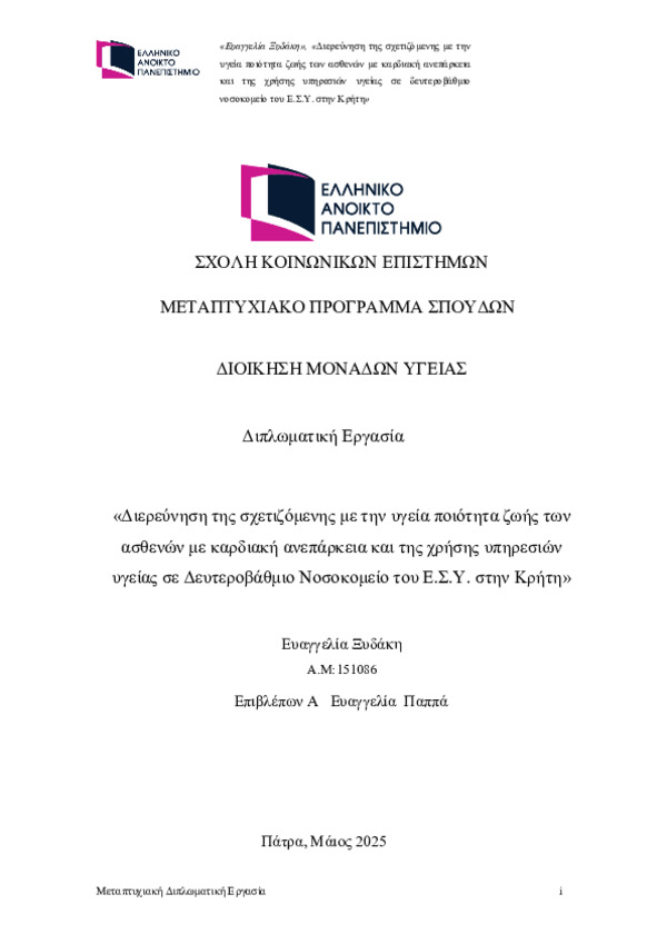Διπλωματική Εργασία «Διερεύνηση της σχετιζόμενης με την υγεία ποιότητα ζωής των ασθενών με καρδιακή ανεπάρκεια και της χρήσης υπηρεσιών υγείας σε Δευτεροβάθμιο Νοσοκομείο του Ε.Σ.Υ. στην Κρήτη» Ευαγγελία Ξυδάκη Περιγραφή: Διπλωματική Εργασία.pdf (pdf)
