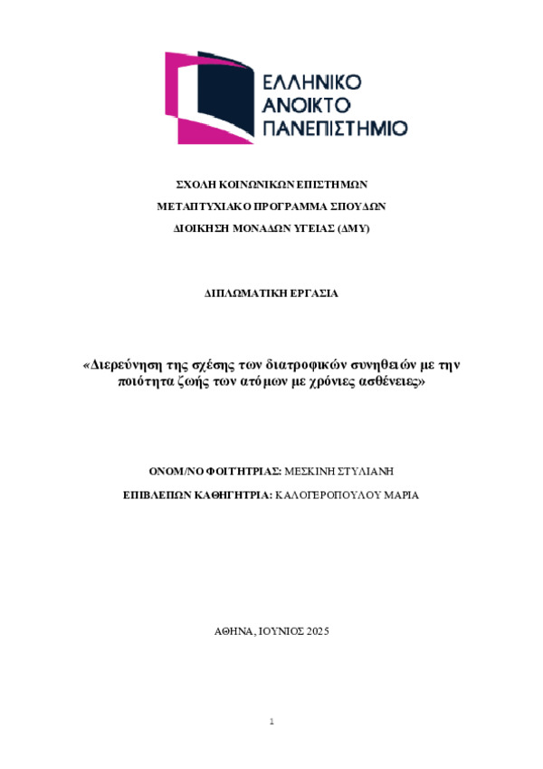- Διατροφικές συνήθειες, ποιότητα ζωής, χρόνιες ασθένειες, Μεσογειακή Διατροφή, SF-36, Kidmed, αγροτικές περιοχές.
