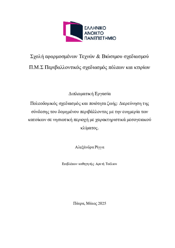 Πολεοδομικός σχεδιασμός και ποιότητα ζωής: Διερεύνηση της σύνδεσης του δομημένου περιβάλλοντος με την ευημερία των κατοίκων σε νησιωτική περιοχή με χαρακτηριστικά μεσογειακού κλίματος.
