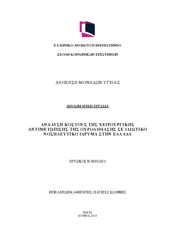 ΑΝΑΛΥΣΗ ΚΟΣΤΟΥΣ ΤΗΣ ΧΕΙΡΟΥΡΓΙΚΗΣ ΑΝΤΙΜΕΤΩΠΙΣΗΣ ΤΗΣ ΟΥΡΟΛΙΘΙΑΣΗΣ ΣΕ ΙΔΙΩΤΙΚΟ ΝΟΣΗΛΕΥΤΙΚΟ ΙΔΡΥΜΑ ΣΤΗΝ ΕΛΛΑΔΑ