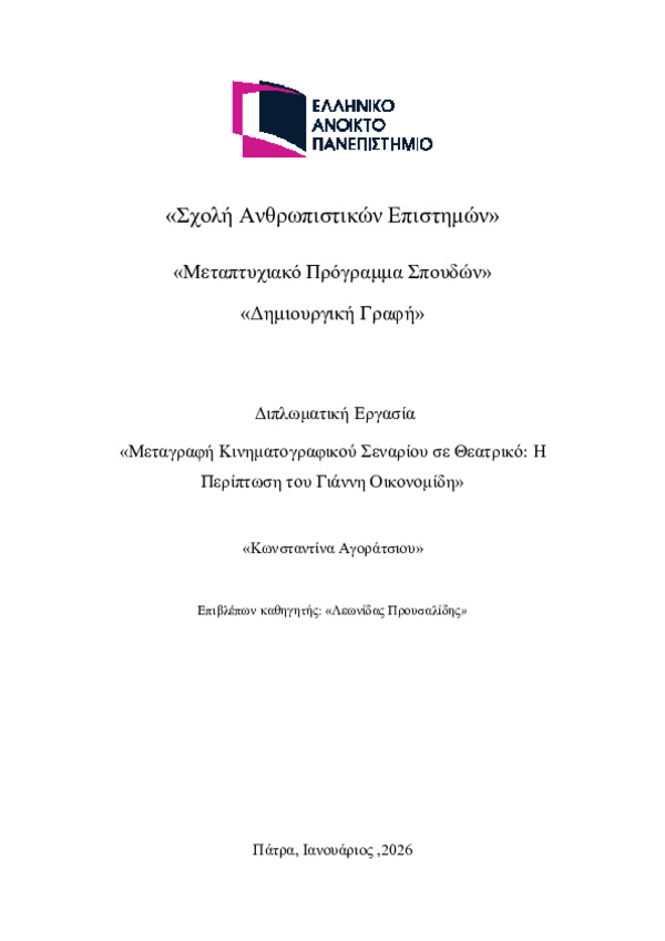 The theoretical part of the study primarily examines adaptation processes related to the cinematic and theatrical positioning of the Greek director and screenwriter, while the first chapters present examples of adaptations and the techniques that characterize them. The selections included in these chapters are connected to elements that are dramaturgically associated with Yiannis Economides.