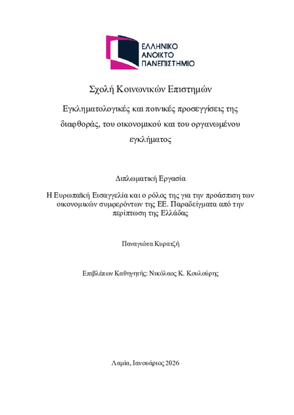 This Master’s thesis examines the role and functioning of the European Public Prosecutor’s Office as an institutional mechanism for the protection of the financial interests of the European Union, placing particular emphasis on the application of the EU prosecutorial institution within the Greek legal framework. The European Public Prosecutor’s Office constitutes the first supranational prosecutorial body vested with autonomous competence to investigate, prosecute and bring before the criminal courts of the EU Member States offences which undoubtedly affect the financial interests of the Union, thereby introducing an innovative model of criminal jurisdiction at EU level. Through the analysis of the historical and institutional framework of the establishment of the European Public Prosecutor’s Office, the presentation of its principles of operation and its European legal basis, the thesis outlines its role in safeguarding the financial interests of the European Union as well as its contribution to the development of an effective anti-crime policy in relation to criminal acts and omissions falling within its jurisdiction. Particular emphasis is placed on the criminological perspective of economic crimes and the role of EPPO on it as well as the examination of the functioning of the European Public Prosecutor’s Office in relation to the Greek State, notably through the analysis of the national legal framework, the role performed by the Greek European Delegated Prosecutors, and the cooperation developed with Greek prosecutorial and administrative authorities. Through the study of specific cases of significant national interest, the thesis identifies critical substantive criminal law and procedural issues, as well as the practical effectiveness of the European Public Prosecutor’s Office in the substantive fight against cross-border crime affecting the financial interests of the European Union. At the same time, a framework of contemporary challenges and future prospects is highlighted, stemming from the need to safeguard issues related to institutional transparency, accountability at EU level and European fiscal oversight, as parameters that underscore the undeniable and continuously evolving role that the European Public Prosecutor’s Office is called upon to play in the future. Within this context, it becomes evident that the European Public Prosecutor’s Office constitutes an essential and necessary instrument for European integration and for the formulation of an effective European anti-crime policy. Such a policy requires close cooperation in the application of the principles of EU law, further institutional strengthening of the Office, and its continuous adaptation to emerging risks associated with economic crime affecting both the European Union and its Member States.