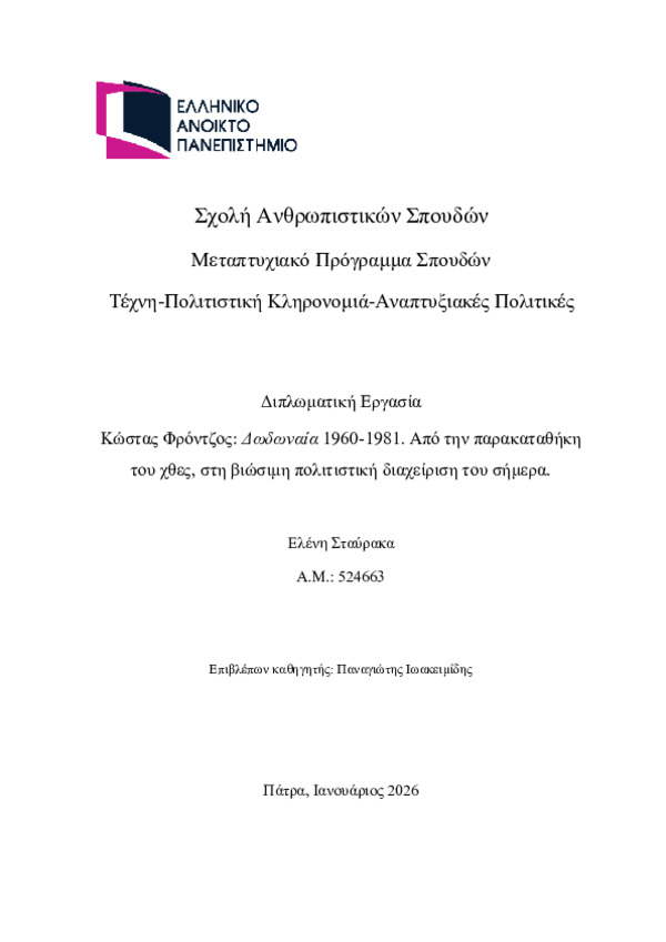 • This master’s thesis examines the diachronic evolution of the archaeological site of Dodona as a field for the formation of collective memory and identity, with a particular focus on the transition from antiquity to post-modernity. The central axis of the study is the postwar activity of Kostas Frontzos and the Society for Epirotic Studies (“E.H.M.”). Through the revival of ancient drama and the institutionalization of the “Dodonaia” festival, Frontzos acted as a visionary figure who reintegrated the monument into contemporary social life. The thesis analyzes how Dodona was transformed from a silent archaeological field into a “site of memory” (lieu de mémoire) and a space of participatory spatiality. This process is situated within the broader cultural geography of Epirus, a region in which memory is inscribed into the relief of the landscape through successive historical stratifications. Through the theoretical substantiation of nationalism and cultural memory, the study highlights the contribution of Frontzos and the Archaeological Service to the formation of a polyphonic Greek identity with an international orientation. Finally, the research advances an innovative proposal for cultural heritage management: the “Living Construction Site” model. Drawing on examples from international practice (Göbekli Tepe), it proposes the transformation of the internal archaeological process into an experiential mode of engagement. This complementary model departs from the conventional centrifugal logic of outward-facing display and instead advocates a core-centered, self-referential approach focused on the monument’s functional nucleus. It thus aspires to translate the internal, “invisible” archaeological process into a contemporary, sustainable, and participatory experience. The ultimate aim is to elevate archaeological work itself into the primary exhibit, enabling Dodona to emerge as a site of international prominence and attraction, linking experiential perception with sustainable development in the digital era.
