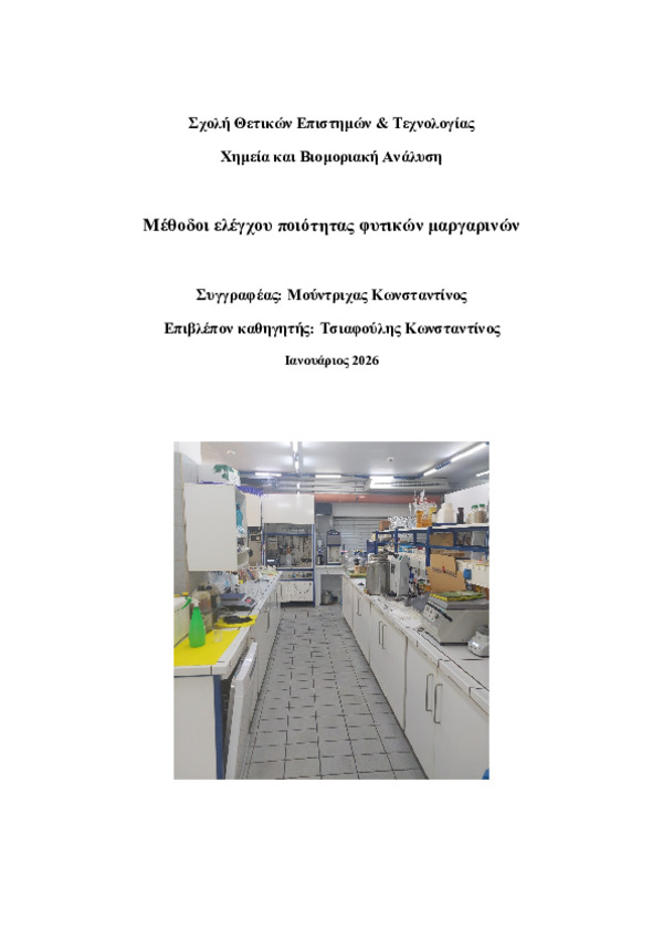 Οι φυτικές μαργαρίνες αποτελούν σύνθετα λιπαρά τρόφιμα με αυξανόμενη σημασία στη σύγχρονη διατροφή, κυρίως λόγω της αντικατάστασης των ζωικών λιπών και της προσαρμογής τους σε διατροφικές και υγιονομικές απαιτήσεις. Η παρούσα διπλωματική εργασία εξετάζει τις βασικές και προηγμένες μεθόδους ελέγχου ποιότητας φυτικών μαργαρινών, με έμφαση στη χημική σύσταση, τη φυσικοχημική σταθερότητα, τη βιομοριακή ανάλυση και τη συμμόρφωση με τη νομοθεσία σε πραγματικό περιβάλλον εργαστηρίου, πραγματοποιώντας και περιγράφοντας τις πραγματικές αναλυτικές τακτικές και μεθόδους σε μια εταιρεία αρωγό στο τομέα αυτό.