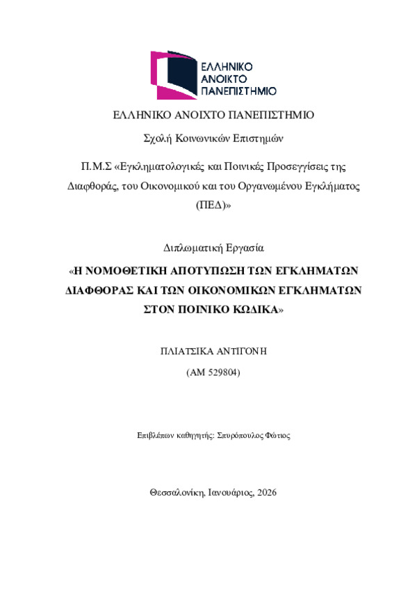 Through this academic paper, the aim is to outline the crimes of corruption and economic crimes within the criminal code. These are two categories of crimes of enormous interest, which have caused various reactions regarding their codification within the legislation. At the same time, they have been the subject of frequent amendments since the enactment of the new criminal code with Law 4619/2019 until today. The core of the study will therefore be to highlight the importance of these crimes with reference to their main characteristics, their protectable legal interest, the manner in which the legislator codified them, the forms they may take, and what changes have occurred in their sentencing over the years.