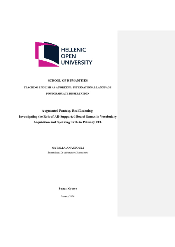 Η παρούσα έρευνα διερευνά την εφαρμογή μιας Ψηφιακής Παιγνιώδους Παιδαγωγικής (ΨΠΠ) μέσω ενός επιτραπέζιου παιχνιδιού με τεχνολογία επαυξημένης πραγματικότητας (ΑR) στο πλαίσιο της διδασκαλίας των Αγγλικών ως Ξένης Γλώσσας (ΑΞΓ) στο δημοτικό σχολείο. Στοχεύει στη διεύρυνση ενός εμπειρικού κενού που αφορά τον συνδυασμό της ΑR με συνεργατικά επιτραπέζια παιχνίδια για την ενίσχυση της απόκτησης λεξιλογίου, των προφορικών δεξιοτήτων και του κινήτρου των μαθητών/τριών νηπιακής ηλικίας, ένα πεδίο ιδιαίτερα υπομελετημένο στο ελληνικό δημοτικό σχολείο. Χρησιμοποιώντας ένα μικτό-μεθοδολογικό σχέδιο δράσης-έρευνας τάξης, η μελέτη συμπεριέλαβε 17 μαθητές/τριες ελληνόφωνης Δ΄ Δημοτικού (επίπεδο Α1 ΚΠΓ). Η παρέμβαση επικεντρώθηκε στο αφηγηματικό επιτραπέζιο παιχνίδι Kids Chronicles: Quest for the Moon Stones, προσαρμοσμένο για ολοτάξιο παιχνίδι με χρήση ενός μόνο tablet. Τα δεδομένα συλλέχθηκαν με τριγωνοποίηση μέσω προ- και μετα-τεστ λεξιλογίου, αυτοαξιολογητικών ερωτηματολογίων μαθητών/τριών και δομημένων παρατηρήσεων του ερευνητή-εκπαιδευτικού. Τα ευρήματα δείχνουν ότι η παιγνιώδης παρέμβαση ενίσχυσε την αυτο-κατευθυνόμενη ενθύμηση λεξιλογίου, με τους μαθητές/τριες να αποκτούν και να διατηρούν επιλεκτικά λεξιλόγιο σχετικό με τη φανταστική αφήγηση του παιχνιδιού (Ερευνητικό Ερώτημα 2). Όσον αφορά την ανάπτυξη της προφορικής επικοινωνίας, καταγράφηκε αξιοσημείωτη αύξηση της προφορικής παραγωγής και της επικοινωνιακής αυτοπεποίθησης, ιδιαίτερα κατά τη διάρκεια δομημένων προφορικών δραστηριοτήτων όπως το Guess Who, όπου πρωταγωνίστησαν η ευχέρεια και η αλληλεπίδραση έναντι της γραμματικής ακρίβειας (Ερευνητικό Ερώτημα 1). Επιπλέον, τόσο οι παρατηρησιακές όσο και οι αυτο-αναφορικές μετρήσεις αποκάλυψαν υψηλά και διατηρηθέντα επίπεδα εγγύτητας και εσωτερικού κινήτρου, τα οποία τροφοδοτήθηκαν πρωτίστως από τη μηχανική του παιχνιδιού, τη συνεργασία των συνομηλίκων και την αφήγηση, και όχι από την τεχνολογία της ΑR κατά μόνας (Ερευνητικό Ερώτημα 3). Η έρευνα συμπεραίνει ότι τα επιτραπέζια παιχνίδια με ΑR λειτουργούν ως ένα αποτελεσματικό υβριδικό παιδαγωγικό εργαλείο, όπου το φυσικό επιτραπέζιο παιχνίδι διευκολύνει τη συμμετοχή και την κοινωνική συνεργασία και το στρώμα της ΑR εμπλουτίζει τη αφηγηματική εμβύθιση. Αποδεικνύει ότι η ψηφιακή παιγνιώδης παιδαγωγική μπορεί να δημιουργήσει ελκυστικά περιβάλλοντα μάθησης χαμηλού άγχους, ακόμα και υπό πραγματικούς περιορισμούς τάξης. Η μελέτη συνεισφέρει εμπειρικά στοιχεία στα πεδία της παιγνιώδους γλωσσικής μάθησης και της τεχνολογικά επαυξημένης διδασκαλίας, προσφέροντας πρακτικές προτάσεις για τους/τις εκπαιδευτικούς ΑΞΓ που επιθυμούν να ενσωματώσουν παιγνιώδεις και επικοινωνιακές προσεγγίσεις στο δημοτικό σχολείο.