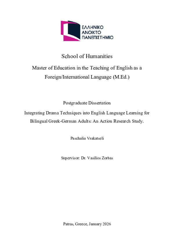 Η ενσωμάτωση τεχνικών δράματος στην εκμάθηση της Αγγλικής Γλώσσας σε δίγλωσσους Έλληνες-Γερμανούς ενήλικες: Μια έρευνα δράσης. (Ελληνική)