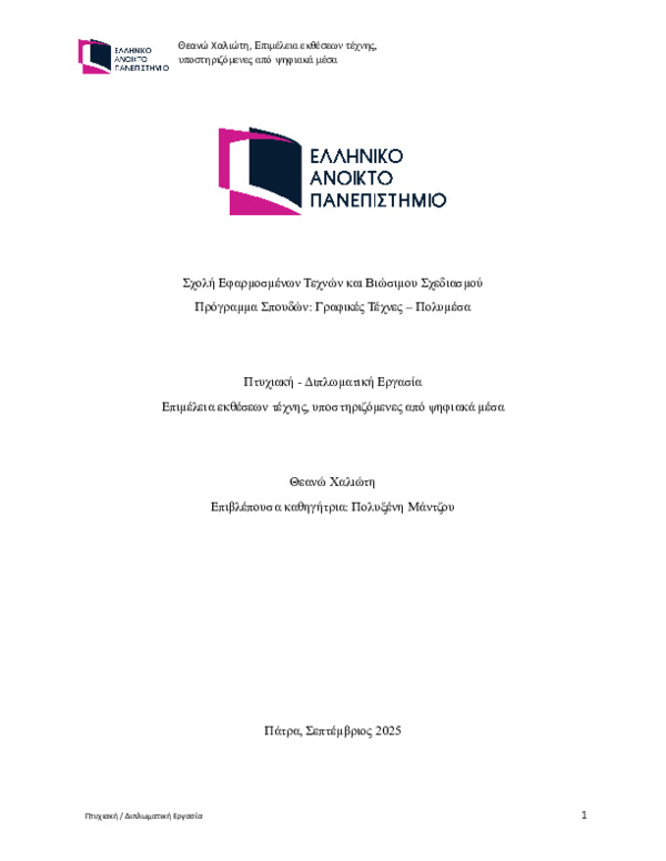 Περίληψη (Abstract): Η παρούσα εργασία διερευνά τον ρόλο της επιμέλειας εκθέσεων τέχνης στο σύγχρονο μουσειακό και καλλιτεχνικό περιβάλλον, με έμφαση στις θεωρητικές προσεγγίσεις, τις εξελισσόμενες επιμελητικές πρακτικές και τη συμβολή των ψηφιακών μέσων. Εξετάζονται θεωρητικά μοντέλα όπως το μοντέλο των ανταγωνιστικών αξιών της Pat Villeneuve, καθώς και έννοιες όπως η «visitor-centered» και η «edu-curation» επιμέλεια...