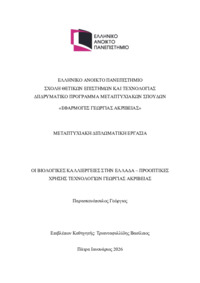 Περίληψη (Abstract): Στην παρούσα εργασία εξετάζεται η πορεία της βιολογικής γεωργίας στην Ελλάδα και στην Ευρωπαϊκή Ένωση με εστιάση τόσο στην ανάπτυξη της αγοράς των βιολογικών προϊόντων όσο και στις προοπτικές ενσωμάτωσης τεχνολογιών ακριβείας σε οργανικές καλλιέργειες. Αρχικά, αναλύεται το θεσμικό πλαίσιο στο οποίο έχει βασιστεί ο τομέας των βιολογικών και ο πολιτικός σχεδιασμός που ακολουθείται τα τελευταία χρόνι...